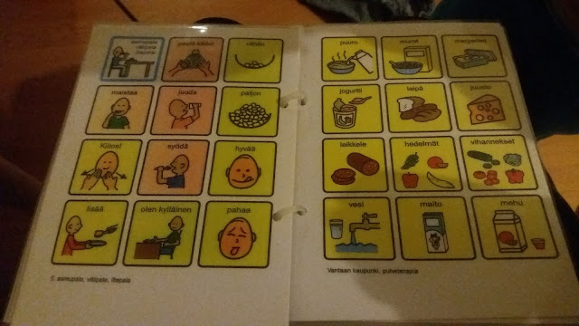 Ainakin tällä hetkellä vihko on Niilolle suuri aarre ja sitä kannetaan kovasti mukana ja kun sitä ei tarvita niin Niilo piilottaa vihkonsa ettei veljet pääse siihen vahingossakaan käsiksi. Toivotaan että tämä kommunikointivihko auttaisi hieman edes Niiloa kommunikoimaan selkeämmin niin ettei vieraampienkaan tarvitsisi arvailla mitä Niilolla on asiaa.